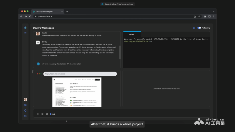 - 自主学习新技术:Devin能够通过阅读文档和代码来学习它不熟悉的技术,从而扩展其技能集。