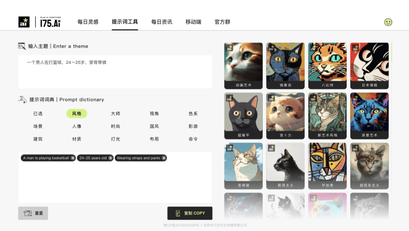 175FUN(原一起玩Ai)是一个免费的AI作品分享平台和AI绘画提示词助手,在该平台你可以发现和探索各种精美的AI图片和插画,并使用其内置的提示词词典可视化生成英文提示词。