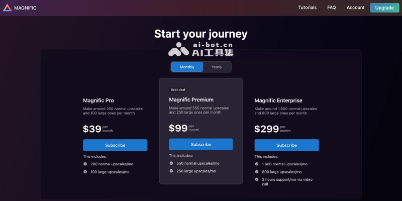 - Enterprise企业版:299美元每月,提供普通放大1600张图片,超级放大800张图片