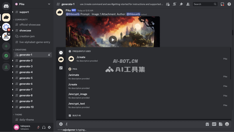 - 加入Pika的Discord社区后,选择任意一个生成频道如#generate-1,然后在输入框中输入/create+提示指令