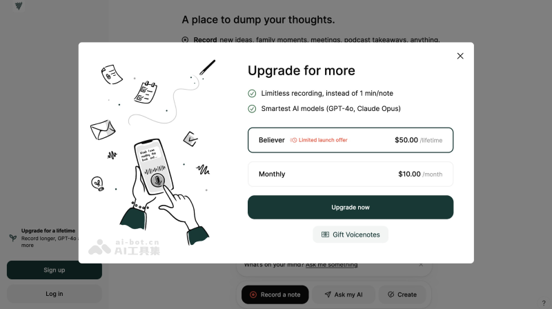 - 付费版:50美元终身、10美元每月,付费后不限制录制时间,且能使用GPT-4o、Claude Opus等更强大的模型