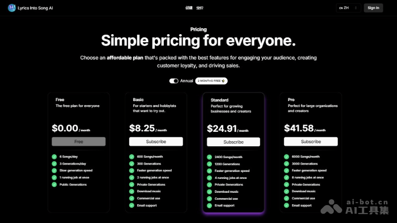 - 标准计划(每月24.91美元):每月2400首歌曲、每月1200次生成、更快的生成速度、一次可以运行四个生成任务、私人生成、音乐下载、商业用途、电子邮件支持